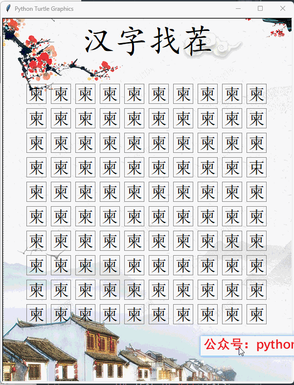 从100个文字中找出不一样的那个,下面是Python文字找茬游戏的效果图